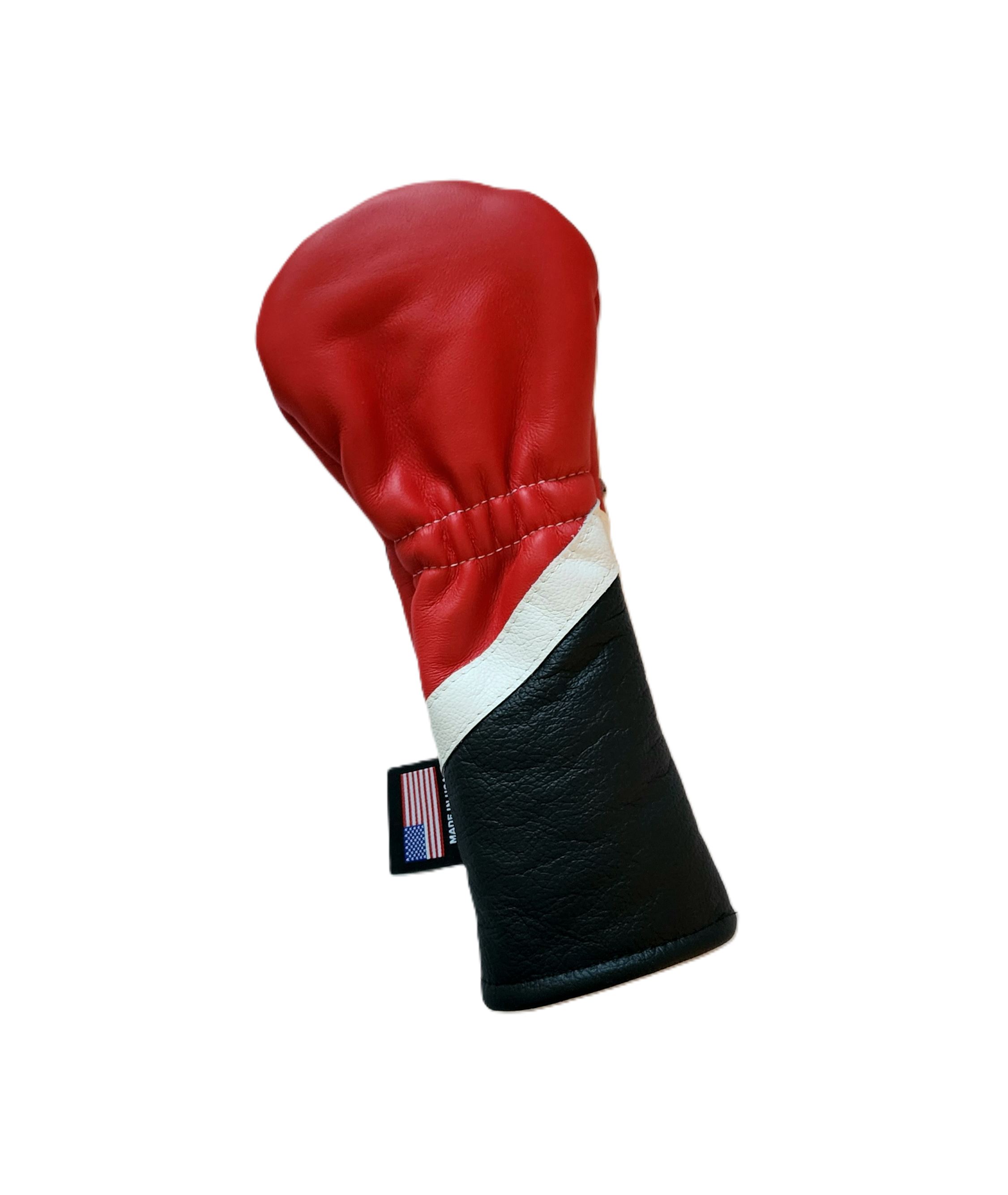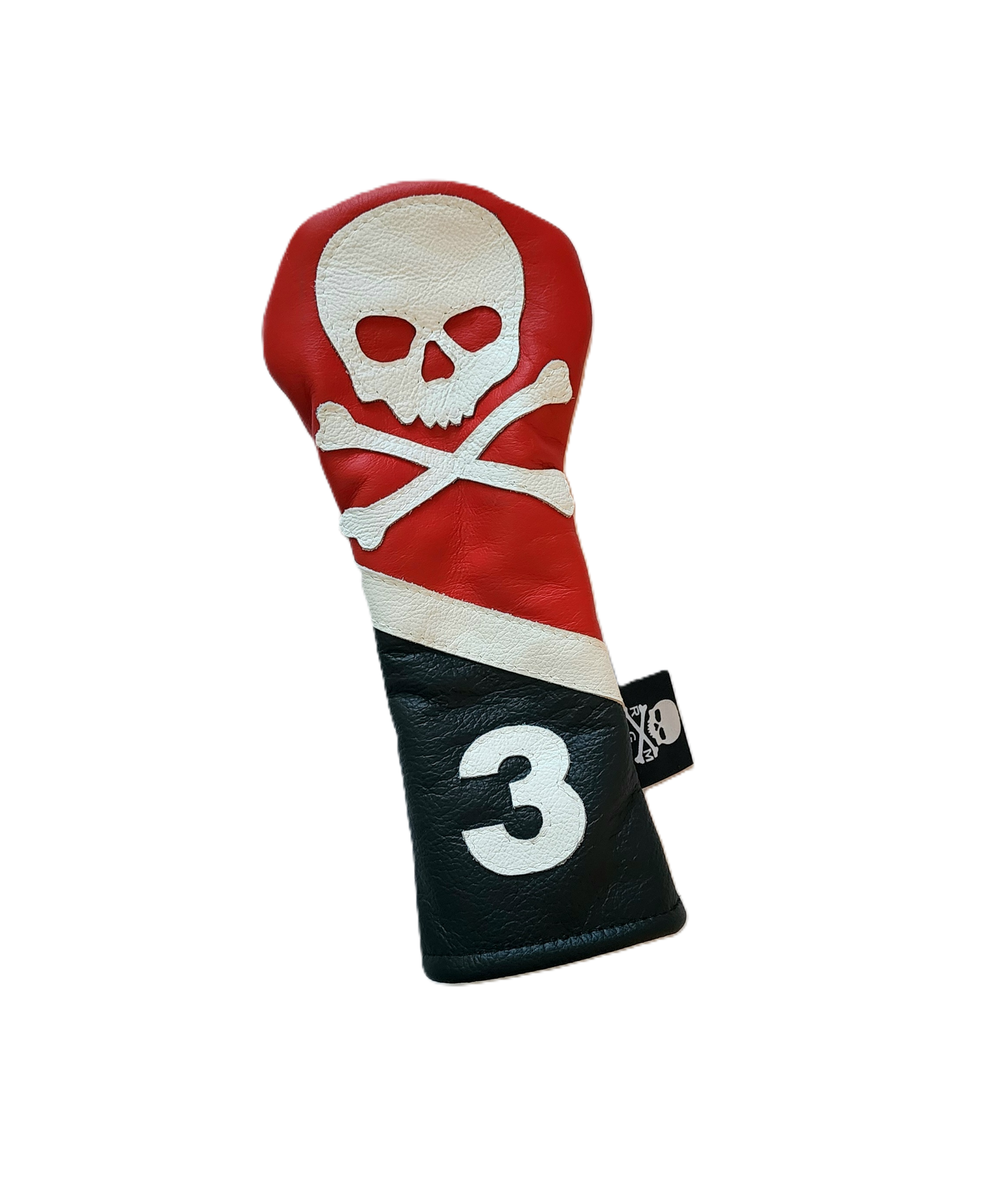 One Of A Kind! USA Skull & Bones, #3, Fairway Wood Headcover is completely hand cut, premium Red, White, & Blue leather. The front applique has white RMG Skull & Bones  #3 design and a diagonal stripe. The back is a matching red, white, blue leather.