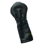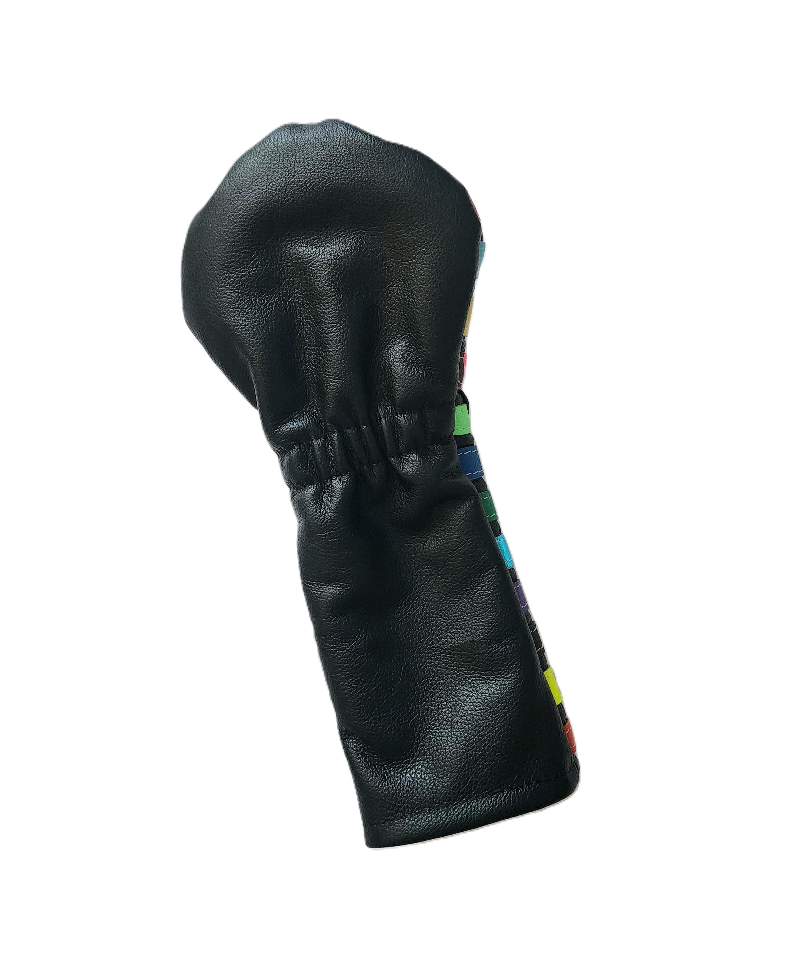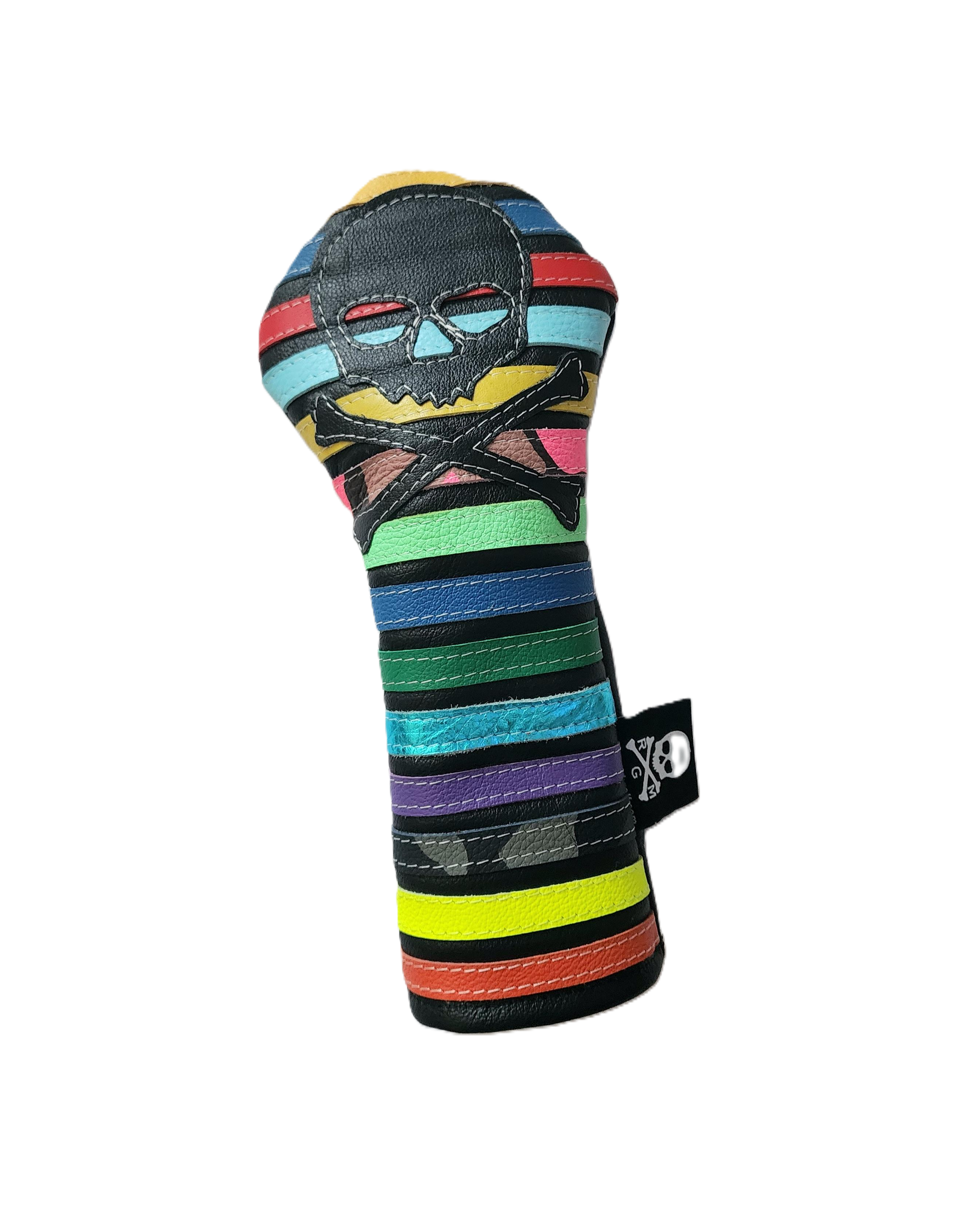 NEW! The Random Rugby Cover is hand cut from premium black pebble grain leather. The back is a matching white pebble grain leather. Note: We put random color stripes in varying widths on the front cover. Each is slightly different. This cover has an added skull & bones. Very cool and colorful headcover that matches any setup!.
