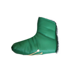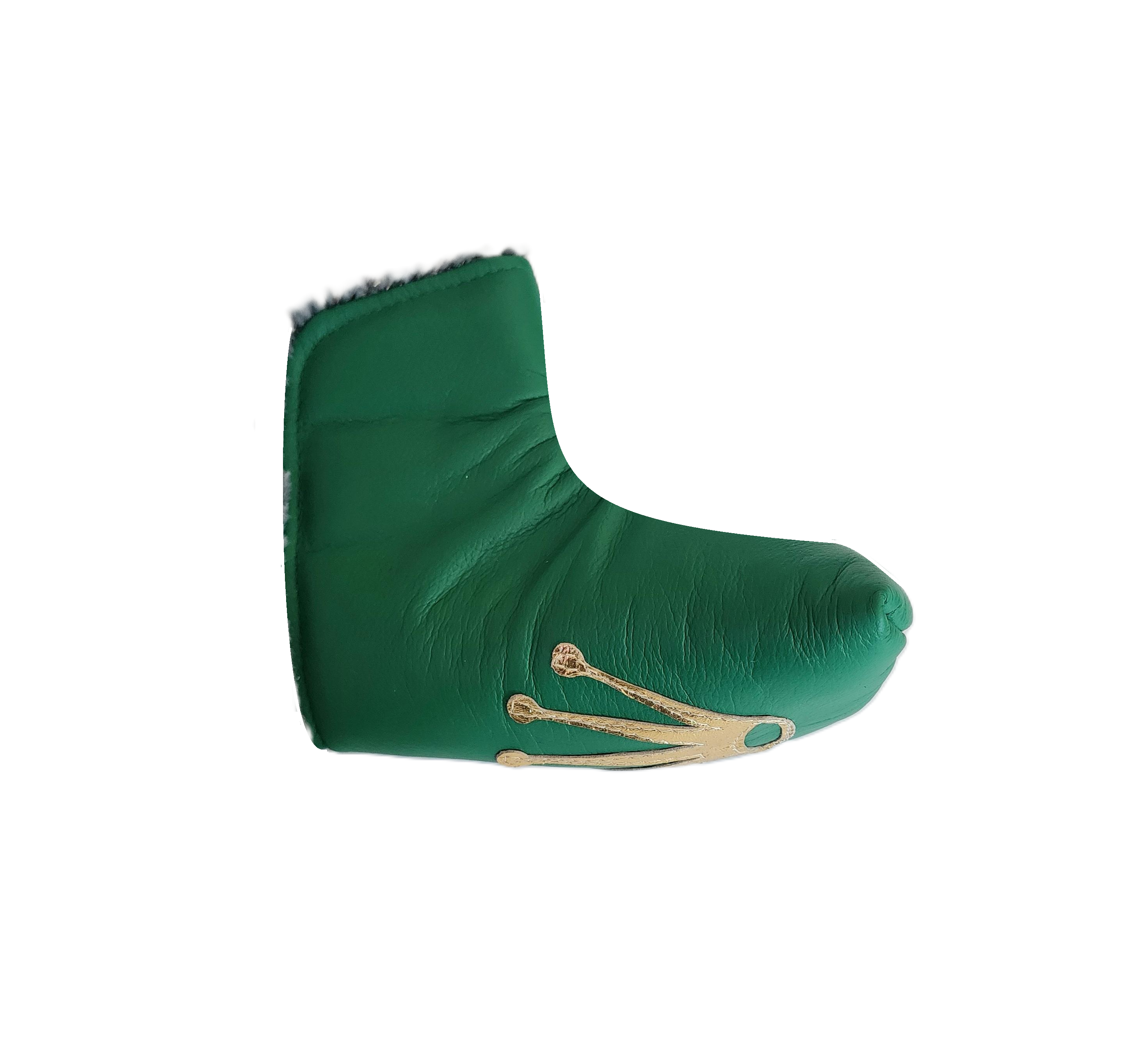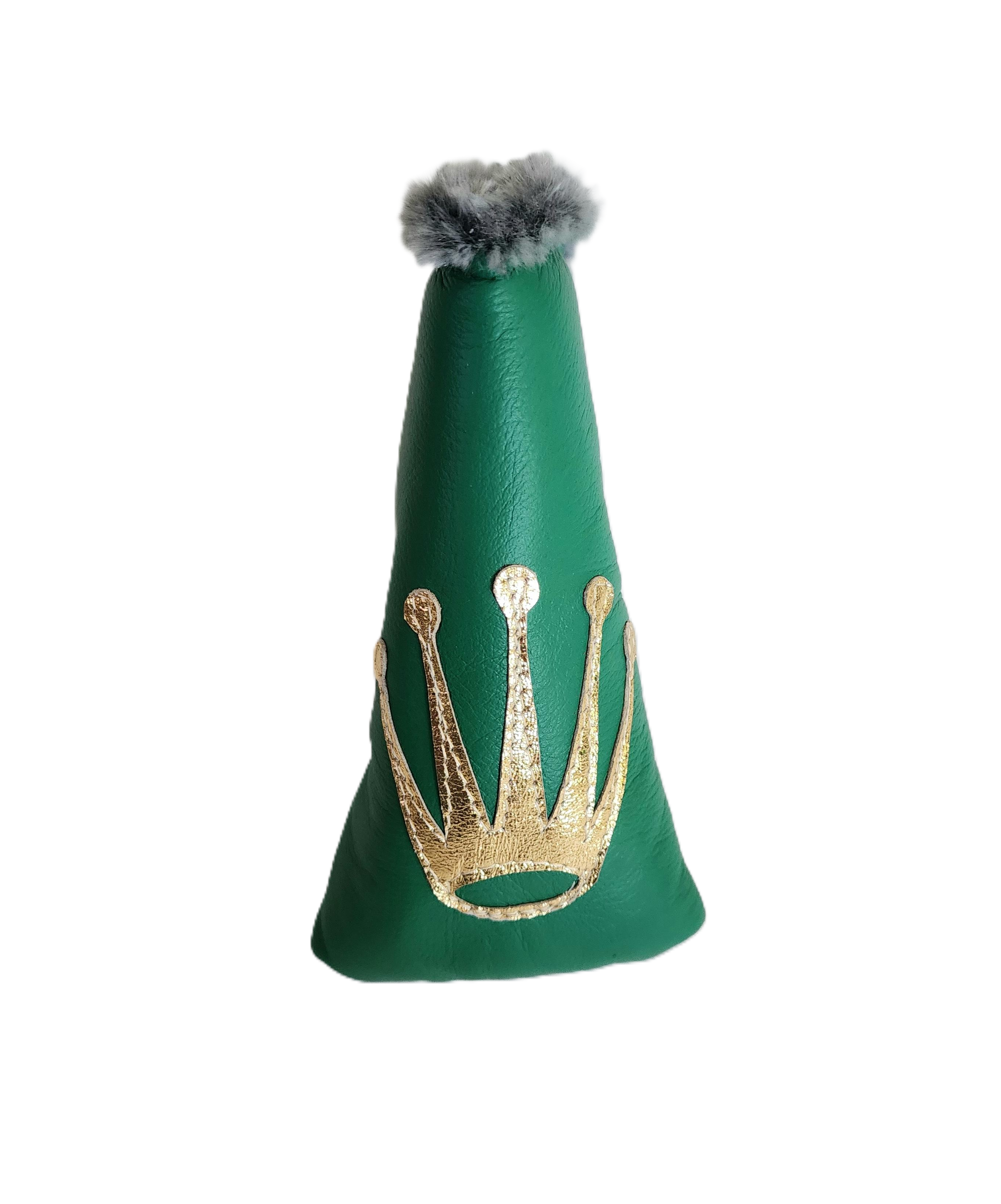 This Rolex inspired, Crown blade Putter Headcover is crafted from premium green cowhide leather. This cover has a Metallic Gold Crown on top. This is a blade style putter cover with faux fur lining and magnetic closure. This cover was a custom overrun and the only one in this design.
