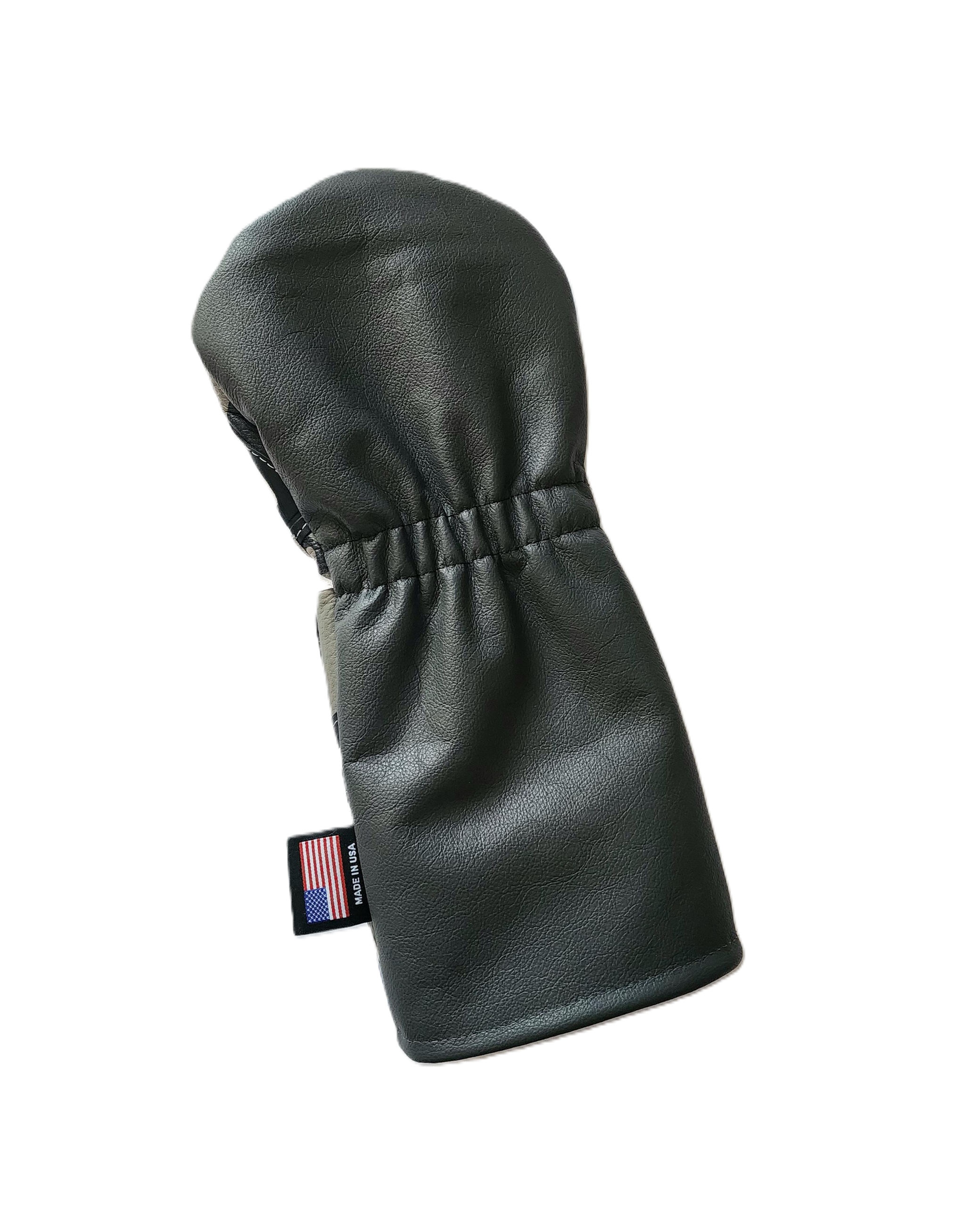 The RMG Collage Driver Headcover is crafted from premium leather. This collage patchwork headcover is crafted from upcycled pieces from Taylormade Golf headcovers. This one is from a Taylormade several headcovers and white leather stars. The base leather for the front cover is grey camo. The back cover is charcoal grey leather. This listing is for the EXACT cover shown in the pics! The cover has upcycled pieces and 100% cowhide leather handsewn. There will be only 1 of this exact design!